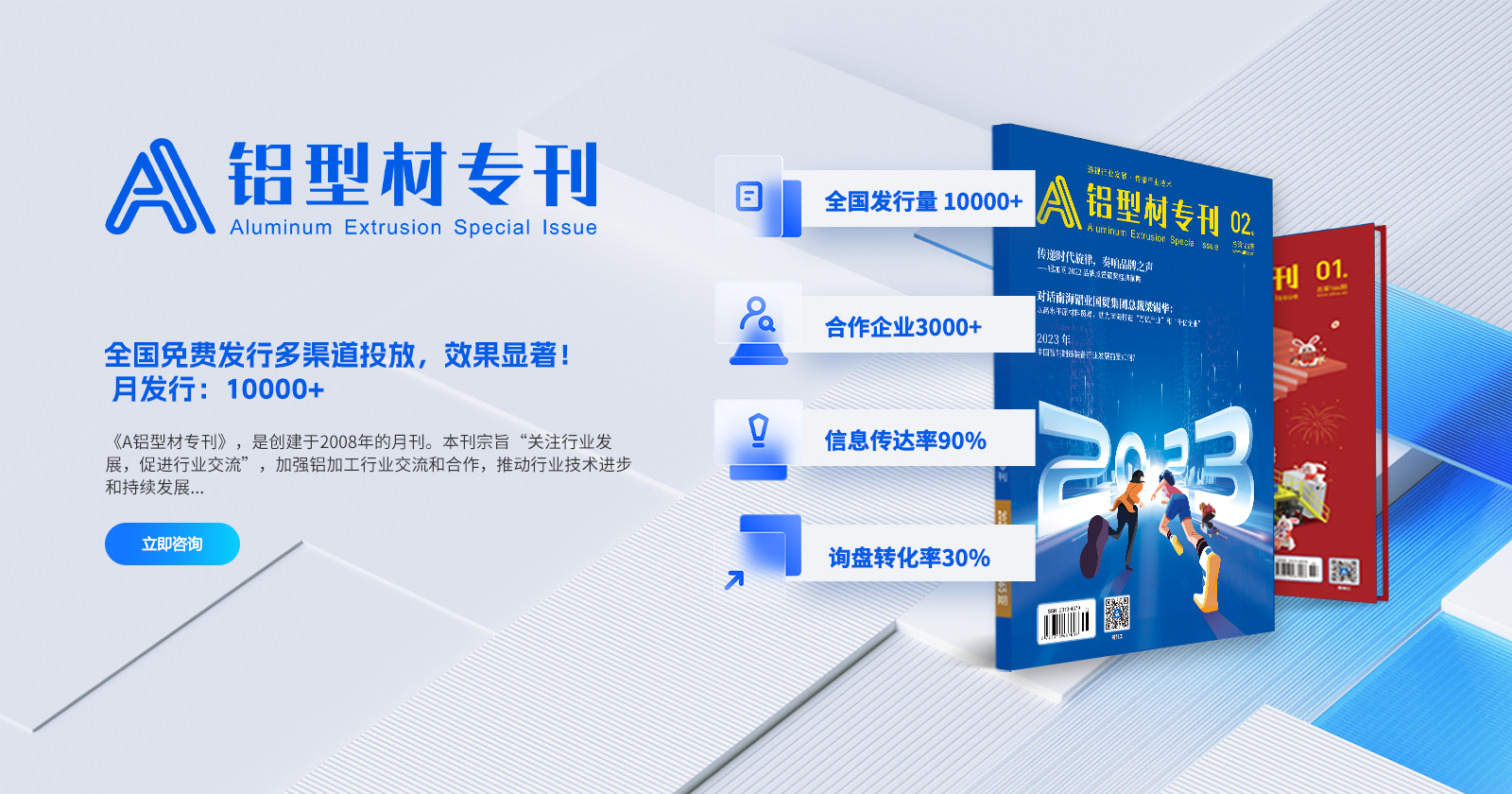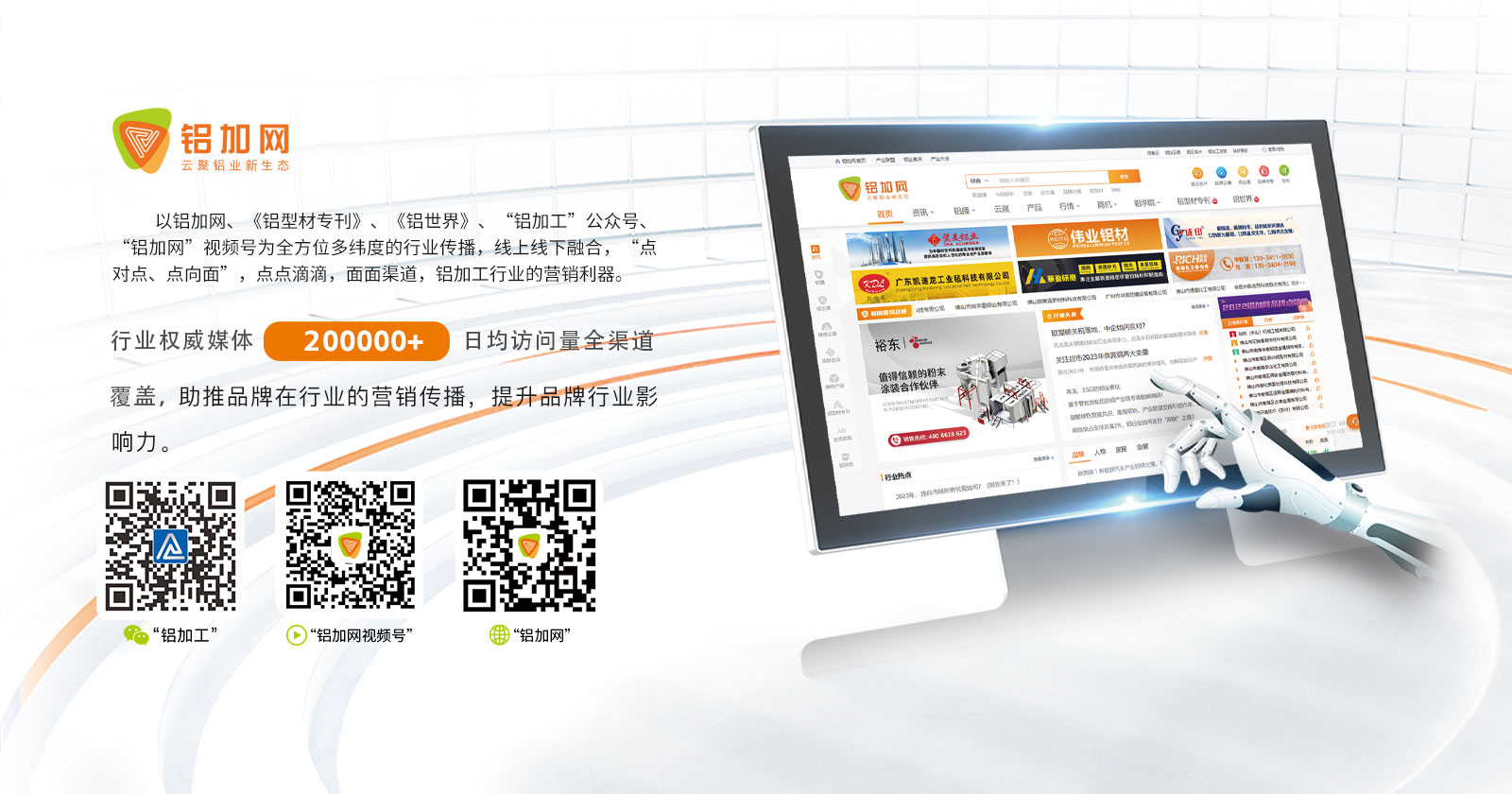 鋁加網(wǎng)(www.albiz.cn)是聞名鋁加工行業(yè)的垂直門戶網(wǎng)站,云聚鋁業(yè)新生態(tài),構建鋁業(yè)新場景,以albiz.cn 網(wǎng)站為核心,以移動云端、鋁加工微信、鋁加網(wǎng)視頻號、《鋁型材專刊》和《鋁世界》雜志為載體,成為了鋁加工行業(yè)資訊和精準傳播的首選傳媒。鋁加網(wǎng),采集和發(fā)布全行業(yè)信息資訊,提供線上展覽、在線直播、短視頻、品牌策劃、品牌運營、品牌傳播等全方位的專業(yè)服務。